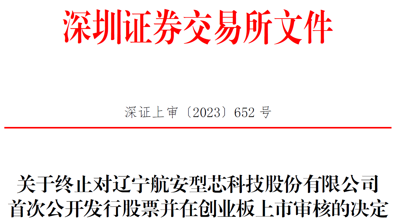 深交所于2022年6月16日依法受理了航安型芯初次揭露发行股票并在创业板上市的请求文件,并依法依规进行了审阅。2023年9月11日,航安型芯向深交所提交了《辽宁航安型芯科技股份有限公司关于撤回初次揭露发行股票并在创业板上市请求文件的请求》,保荐人招商证券股份有限公司向深交所提交了《关于撤回辽宁航安型芯科技股份有限公司初次揭露发行股票并在创业板上市请求文件的请求》。依据《深圳证券交易所股票发行上市审阅规矩》第六十二条的有关法律法规,深交所决议停止对航安型芯初次揭露发行股票并在创业板上市的审阅。